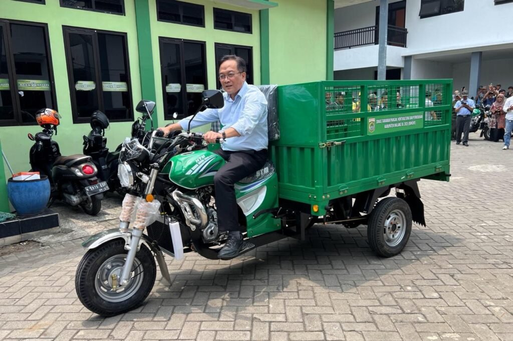 RODA TIGA: Kepala Dinas TPHP, Avicenna Sani Putera, saat mencoba kendaraan angkut roda tiga. Ada 11 unit kendaraan yang diserahkan kepada 11 kelompok tani. (Foto: Ra Indrata/Malang Post)