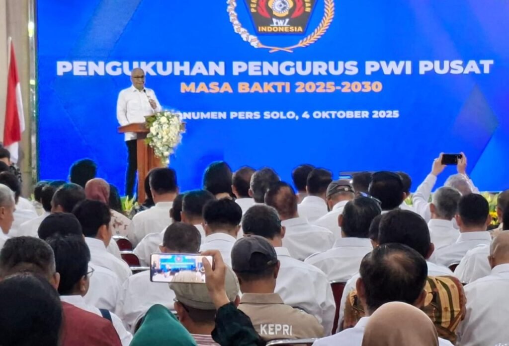 RESMI: Ketua PWI Pusat, Akhmad Munir, ketika mengukuhkan sekitar 130 pengurus PWI Pusat masa bakti 2025-2030 di Museum Pers Nasional, Surakarta, Sabtu (4/10/2025) kemarin. (Foto: Istimewa)