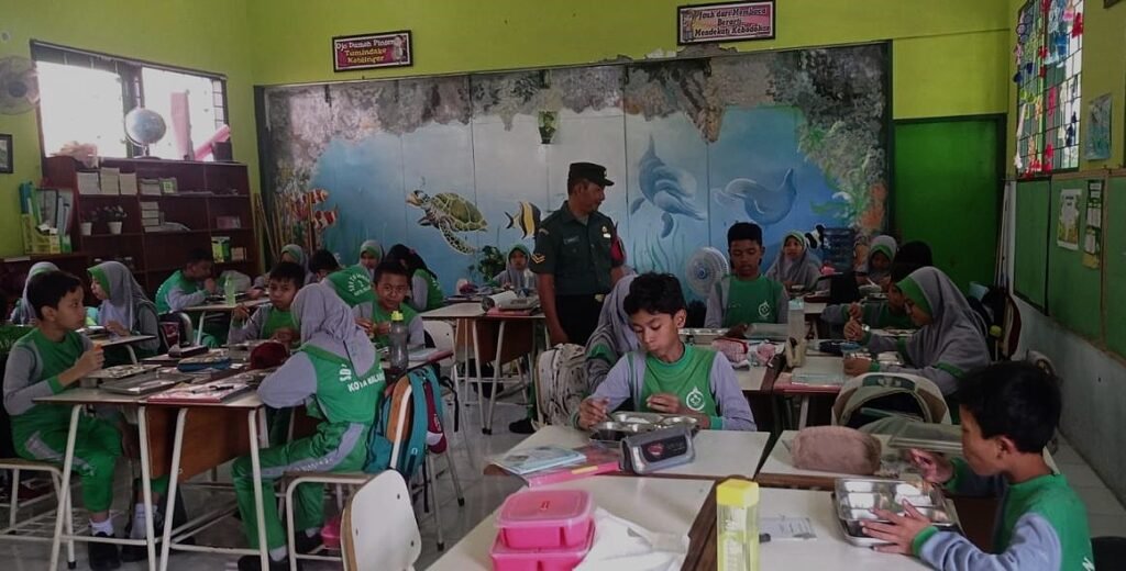 Malang Post – Sertu Sugeng Babinsa Kelurahan Tlogomas, Koramil 0833 – 05/Lowokwaru, mendampingi kegiatan Makan Bergizi Gratis yang digelar di SDN 2 Tlogomas, Kota Malang, Kegiatan ini merupakan bagian dari program pemerintah dalam upaya meningkatkan gizi anak sekolah serta mendukung tumbuh kembang generasi muda yang sehat dan cerdas, Kamis, (09/10).