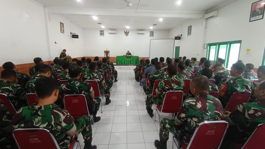 Malang Post – Komandan Kodim 0833/Kota Malang Letkol Inf Dedy Azis, memberikan Jam Komandan kepada seluruh prajurit dan PNS Kodim 0833 di Aula Makodim 0833, Jumat (10/10/25). Kegiatan rutin ini menjadi sarana komunikasi langsung antara pimpinan dengan anggota guna menyampaikan arahan, evaluasi, serta memperkuat soliditas satuan.