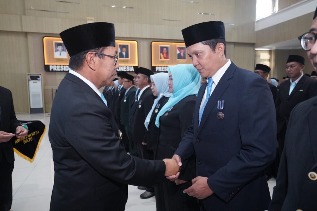 BERI SELAMAT: Wali Kota Batu, Nurochman saat memberikan selamat kepada para ASN Pemkot Batu penerima tanda kehormatan. (Foto: Ananto Wibowo/Malang Post)