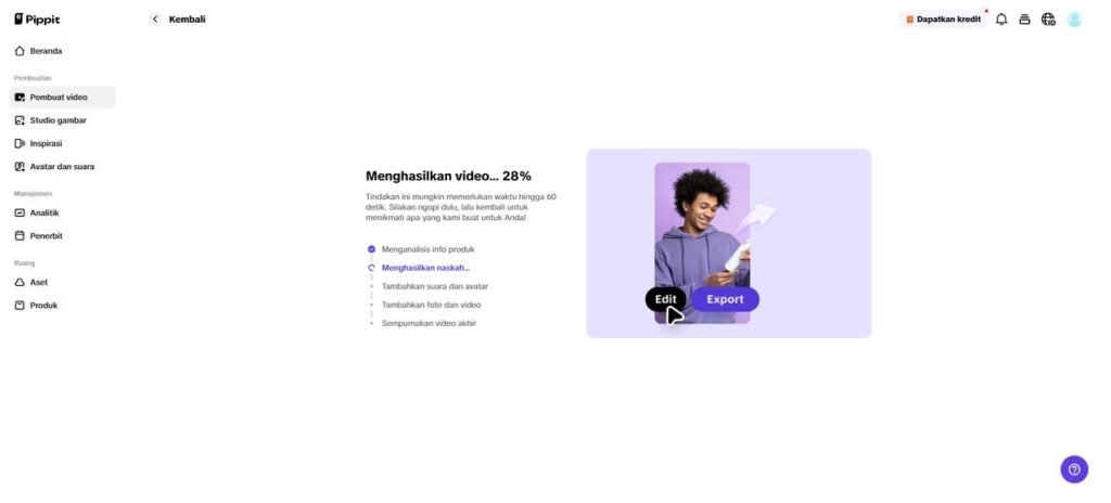 Generator AI mengolah prompt dan media yang kamu unggah. Ia mengatur tempo, transisi, efek, serta menambahkan avatar, caption, dan visual otomatis.