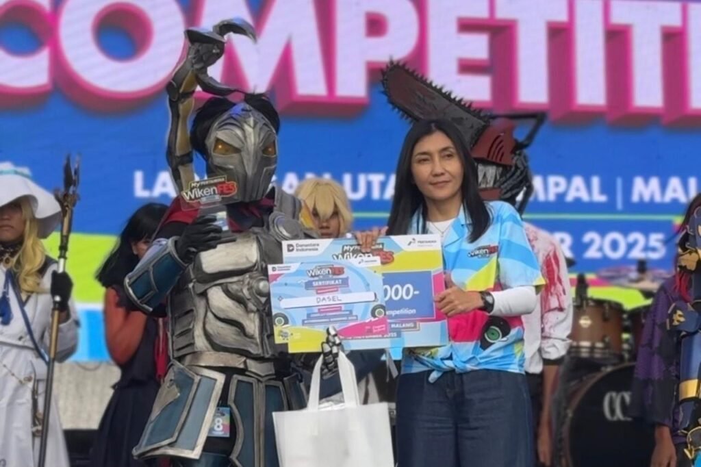 ACTION FIGURE: Pemenang cosplay walk, ketika menerima hadiah dari WikenFES yang digelar di Lapangan Rampal. (Foto: Pertamina for Malang Post)
