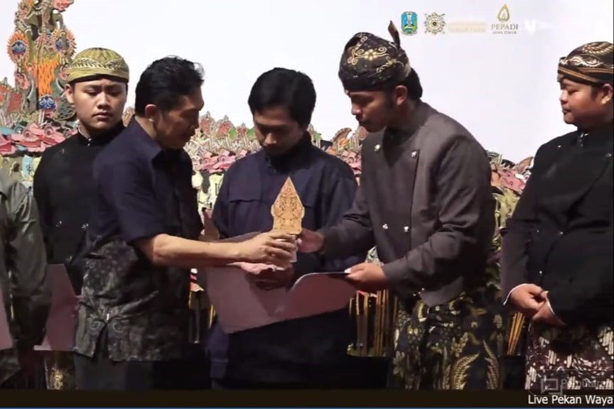 JUARA 2: Ki Nyoto Rafi Suryo Darsono saat menerima piala dari Provinsi Jawa Timur dalam Festival Dalang Muda Jawa Timur 2025 kemarin lusa (18/11/2025). (Foto: Istimewa)