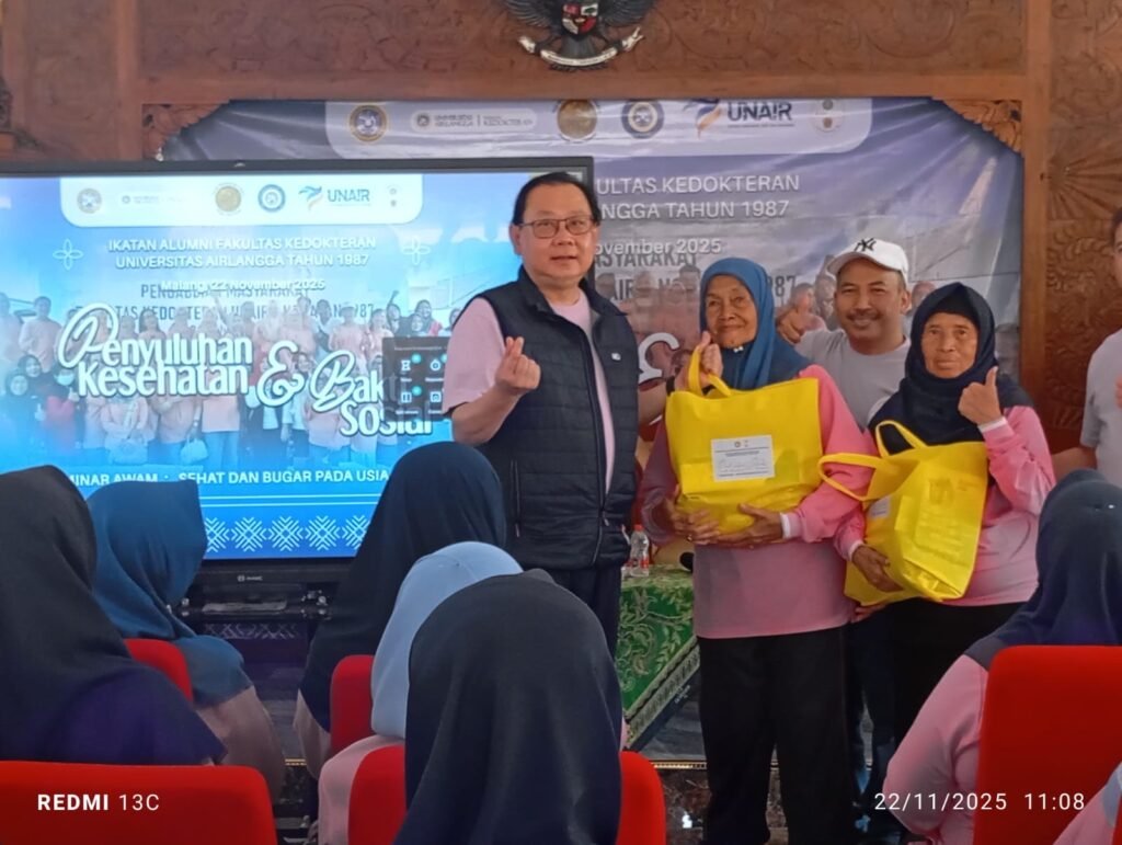 Saat menggelar pengabdian kepada masyarakat Ikatan Alumni 1987 FK Unair ini juga dikemas dengan bakti sosial berbagi paket bingkisan.