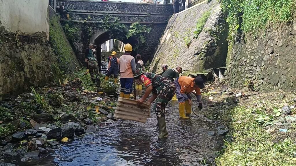 Malang Post – Mengantisipasi potensi banjir memasuki musim hujan, Bintara Pembina Desa (Babinsa) Koramil 0833 – 01/ Klojen, Kelurahan Kasin, Kecamatan Klojen, Kota Malang, bersama warga setempat dan perangkat kelurahan melaksanakan karya bakti pembersihan lingkungan pada Sabtu,( 06/12) .