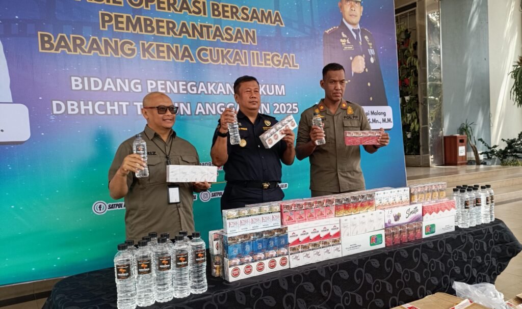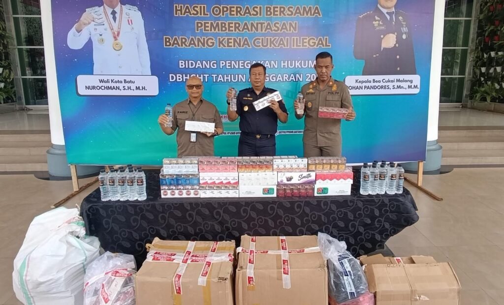 MALANG POST – Pemkot Batu menunjukkan komitmennya memerangi peredaran rokok ilegal. Sepanjang tahun 2025, Satpol PP Kota Batu bersama Bea Cukai Malang berhasil mengamankan 94.284 batang rokok ilegal dari berbagai merek tanpa pita cukai. Tak hanya itu, petugas juga menyita 30 botol atau 18 liter minuman mengandung etil alkohol ilegal.
