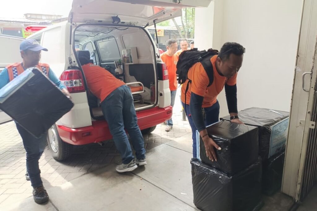 TOTALITAS: Anggota Jurnalis Siaga Bencana (JSB) PWI Malang Raya, saat menurunkan bantuan yang dihimpun dari para donatur di Kantor Cabang JNE Malang. JNE yang akan mengirimkan bantuan tersebut ke Aceh. (Foto: JSB PWI Malang Raya)
