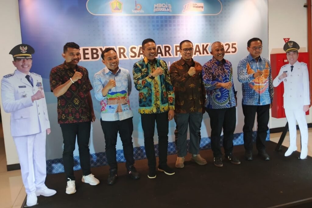 OPTIMIS: Wali Kota Malang, didampingi Wawali, Sekkota, Ketua Komisi B DPRD, serta perwakilan Kejari serta Kepala Bapenda, dalam acara GSP 2025, di auditorium MCC. (Foto: Iwan Irawan/Malang Post)