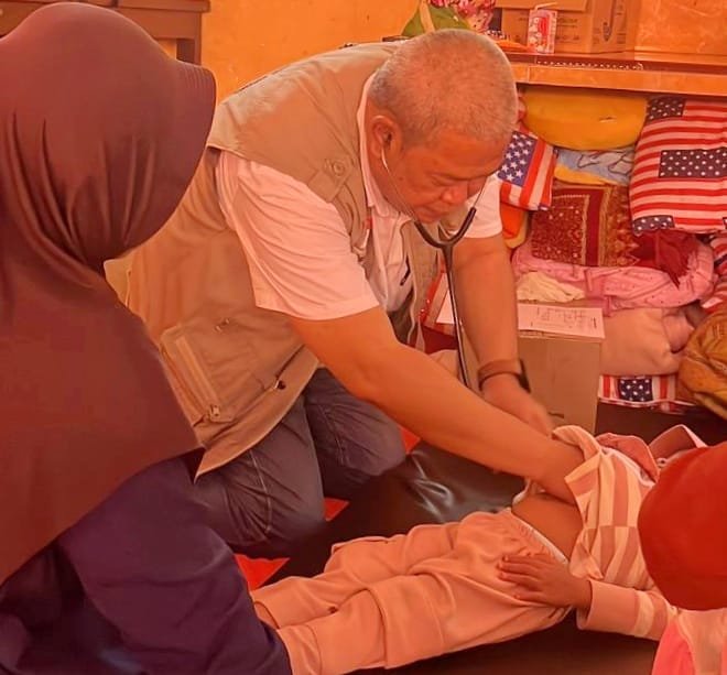Tim medis memberikan pemeriksaan dan pengobatan langsung untuk keluhan kesehatan umum serta potensi penyakit yang lazim muncul dalam situasi pengungsian.