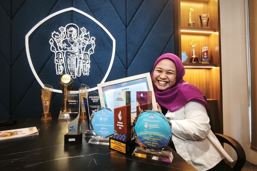 Foto salah satu staf humas UB bersama deretan penghargaan yang didapat UB selama beberapa tahun terakhir. (Foto: Istimewa)