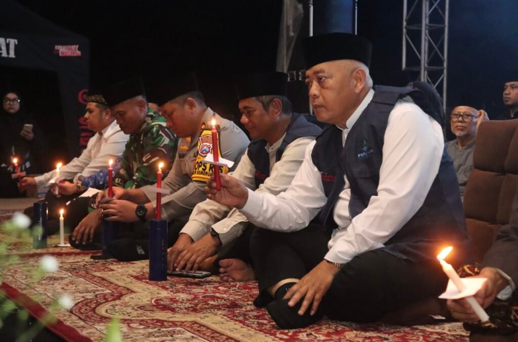 Sebelum detik-detik pergantian tahun menuju 2026, KH Fadol Hijja, Ketua MUI Kabupaten Malang, memimpin doa bersama. Berlangsung dalam suasana khidmat dengan balutan cahaya temaram dari nyala ribuan lilin. (*/Ra Indrata)
