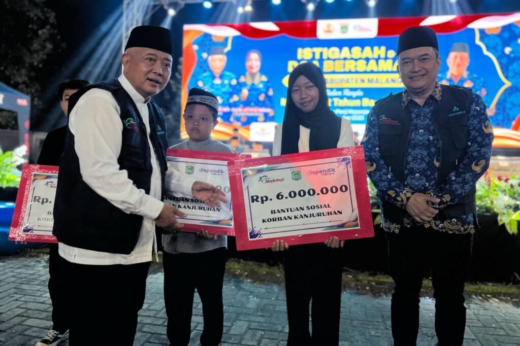 SANTUNAN: Sebelum memulai istigasah dan doa bersama, Bupati Malang, didampingi Sekda Kabupaten Malang, menyerahkan bantuan sosial kepada keluarga korban Tragedi Kanjuruhan. (Foto: Ra Indrata/Malang Post)