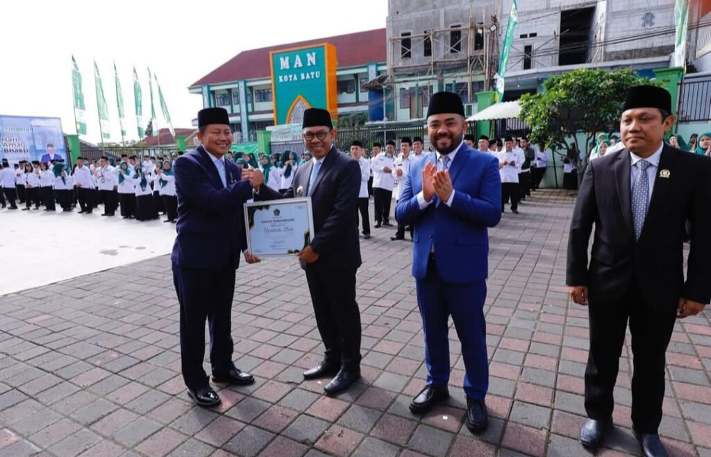 Mengusunh tema ‘Umat Rukun dan Sinergi, Indonesia Damai dan Maju’, Wali Kota Batu Nurochman bertindak sebagai Inspektur Upacara pada peringatan HAB yang digelar di MAN Kota Batu.