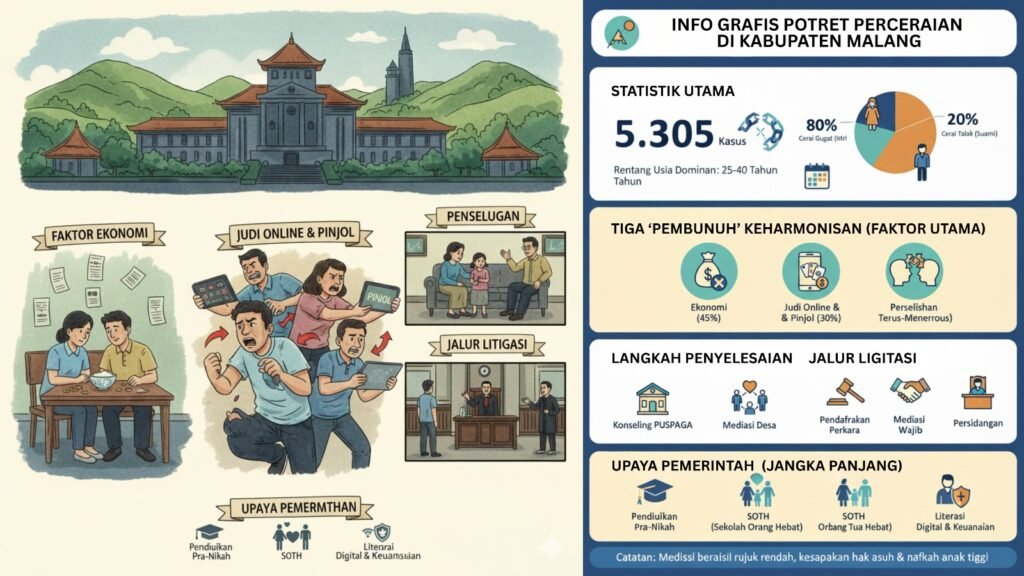 Pemerintah Kabupaten Malang, melalui berbagai dinas terkait, telah meluncurkan beberapa inisiatif strategis untuk menekan angka perceraian yang terus meningkat.
