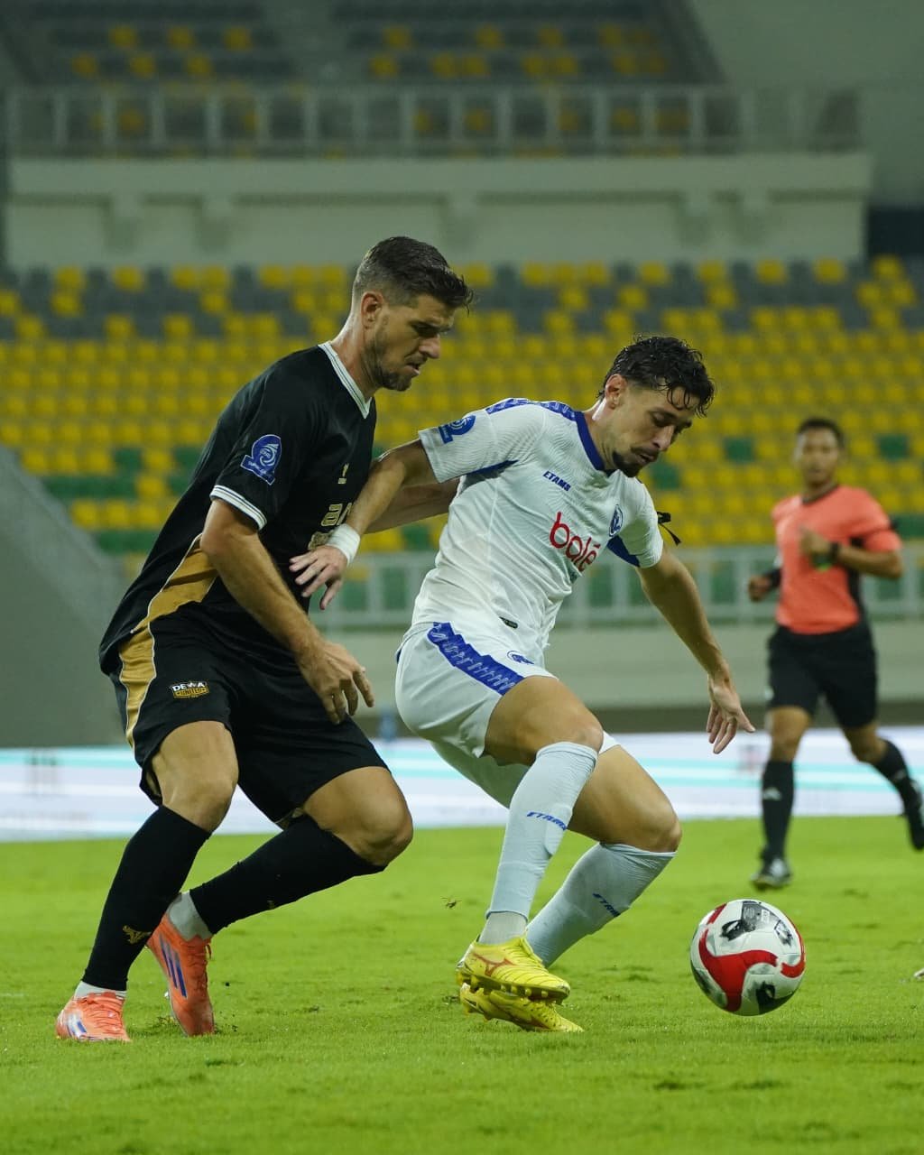 BARU: Gustavo Franca ditempel ketat Nick Kuipers. Meski hanya tampil 75 menit, tetapi mantan pemain Persija ini cukup memberikan warna di sisi serangan Arema FC. (Foto: Arema Official)
