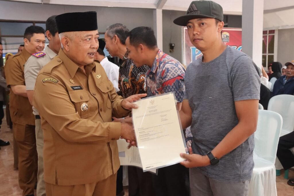 SIMBOLIS: Bupati Malang, HM Sanusi, ketika menyerahkan salah satu sertifikat tanah hasil dari redistribusi tanah, kepada salah satu warga Tirtoyudo. (Foto: Prokopim Sekda Kab. Malang)
