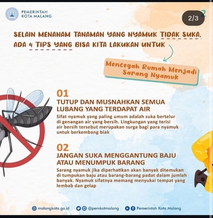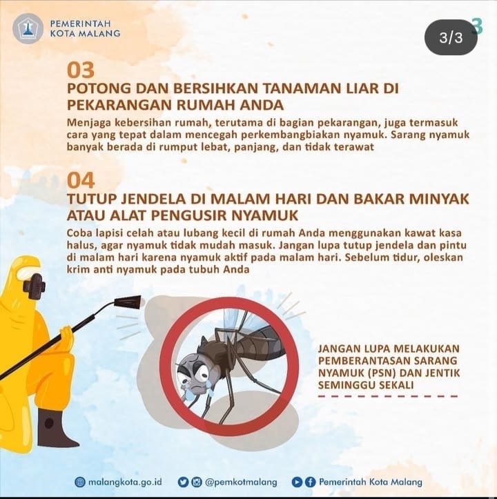 - Jaga kebersihan lingkungan, bersihkan saluran air, kurangi tumpukan sampah, dan potong tumbuhan yang bisa jadi sarang nyamuk.