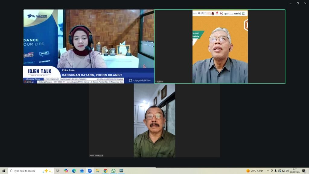 MALANG POST – Anggota Komisi C DPRD Kota Malang, Arief Wahyudi, saat menjadi narasumber talk show di program Idjen Talk menjelaskan, penebangan pohon yang sempat terjadi salah satunya di kawasan drainase Soehat, sebenarnya sudah disertai komitmen penanaman ulang.