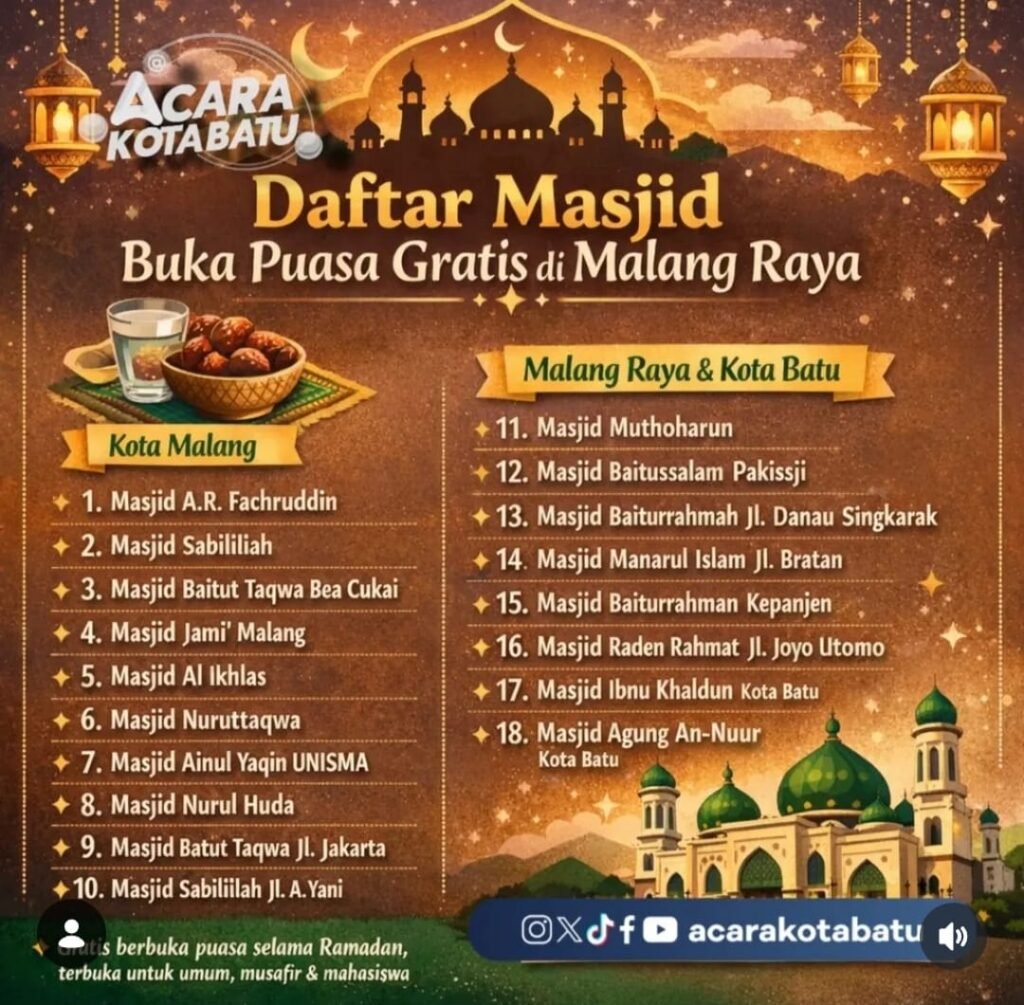 Bagi warga yang memilih berbuka di luar rumah, deretan masjid di Malang Raya bisa menjadi pilihan yang tenang dan menyenangkan. Selain hidangan gratis, berbuka puasa bersama di masjid juga menawarkan pengalaman spiritual berbeda.