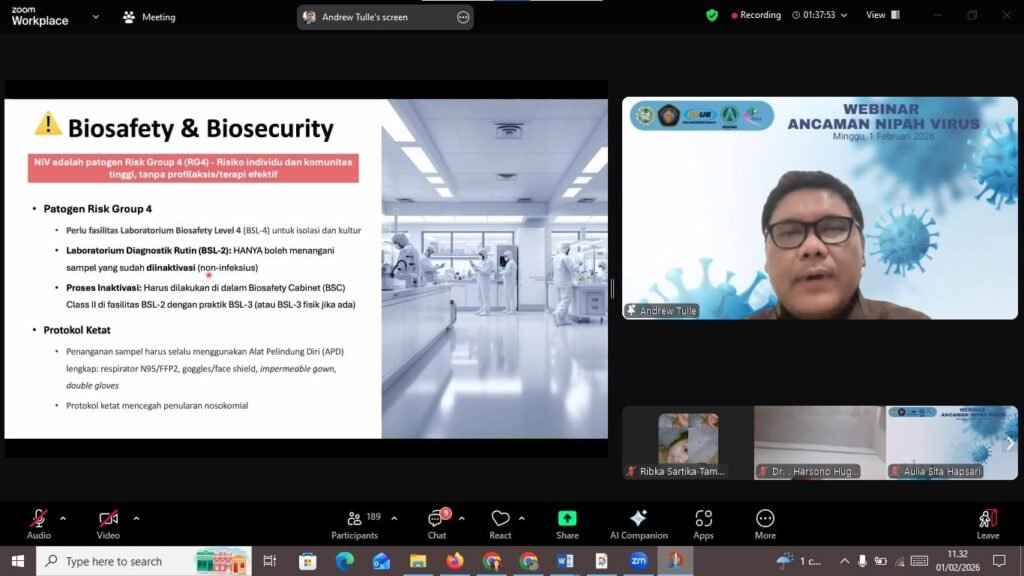 “Penanganan virus Nipah tidak bisa dilakukan secara parsial. Kita harus membangun ekosistem yang saling menguatkan antara laboratorium, klinisi, hingga manajemen fasilitas kesehatan,” ujarnya.