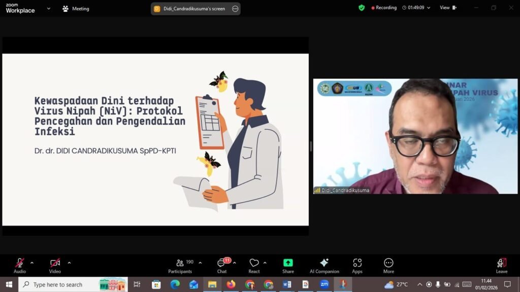 MALANG POST – Di balik setiap wabah Nipah yang berpotensi meluas, terdapat jaringan kerja yang terintegrasi antara laboratorium, klinisi dan sistem kesehatan secara menyeluruh. Itulah pesan yang menonjol dari Webinar “Ancaman Virus Nipah” yang digelar awal bulan ini oleh Pusat Infeksi Terpadu Rumah Sakit Universitas Brawijaya (RSUB) bekerja sama dengan Perhimpunan Kedokteran Tropis dan Penyakit Infeksi (PETRI) Cabang Malang.