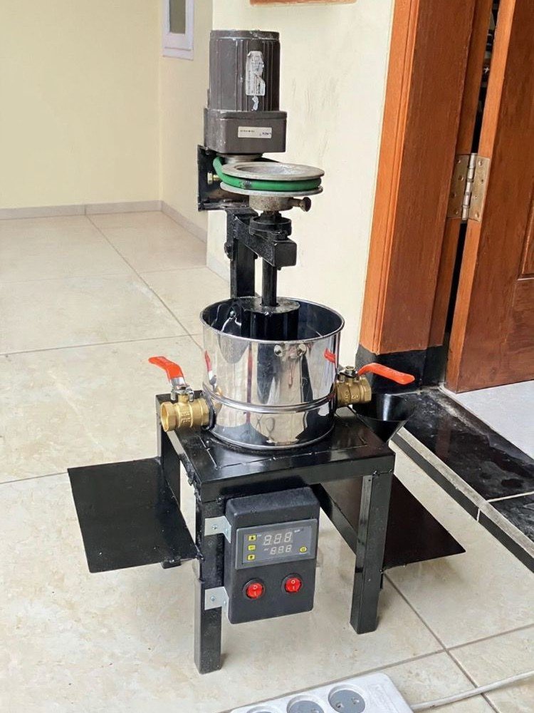 Mesin ini dirancang untuk skala rumah tangga dan UMKM. Prosesnya dimulai dari tahap filtrasi untuk memisahkan kotoran padat. Selanjutnya minyak dipanaskan agar lebih encer dan mudah dicampur dengan bahan pendukung.