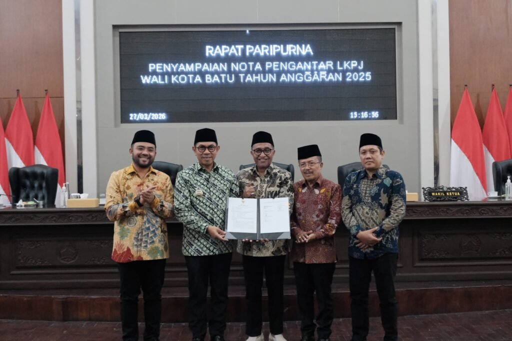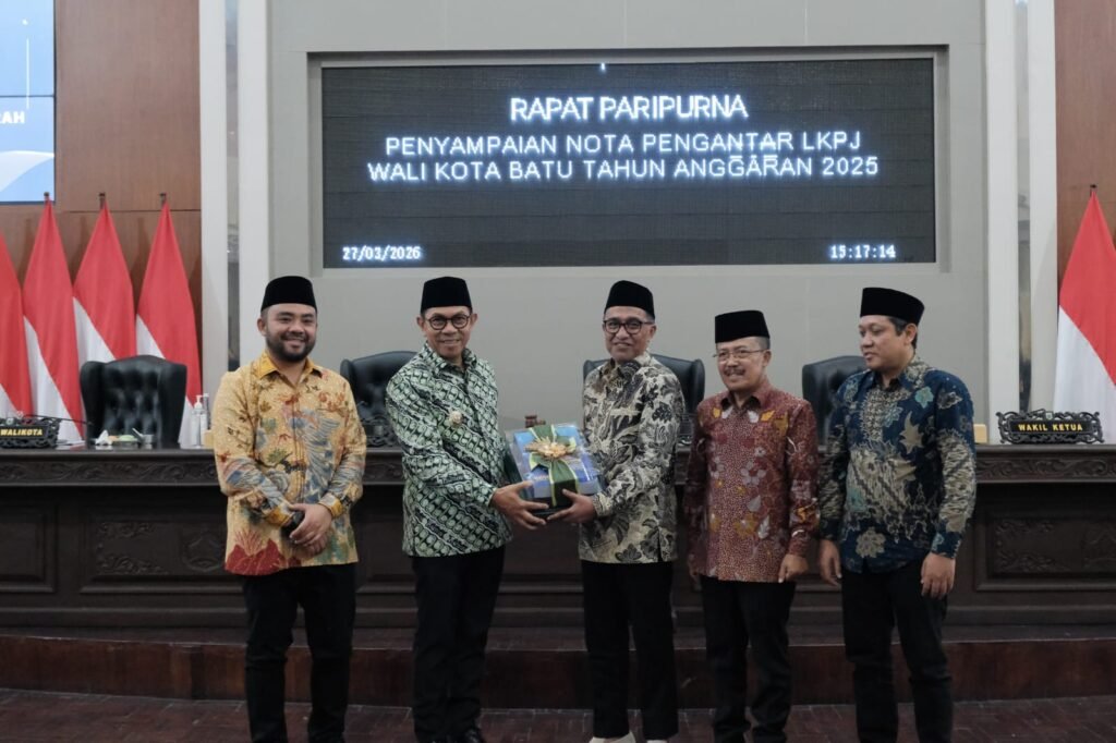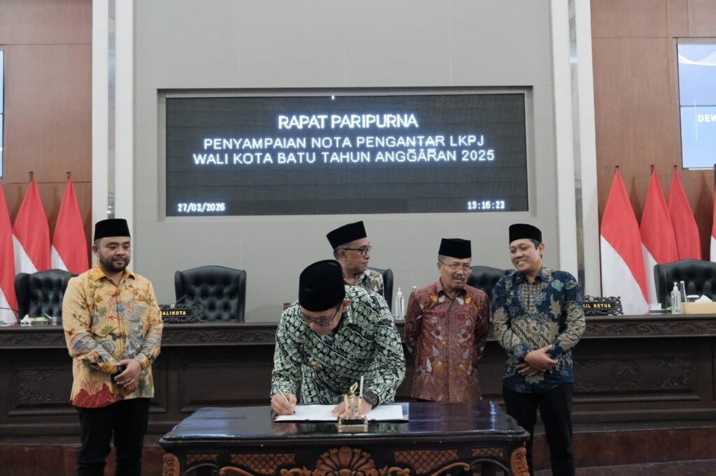 MALANG POST – Pemkot Batu memaparkan berbagai capaian pembangunan sepanjang tahun anggaran 2025. Hal itu disampaikan Wali Kota Batu, Nurochman dalam rapat Paripurna Laporan Keterangan Pertanggungjawaban (LKPJ) Tahun Anggaran 2025 di hadapan DPRD Kota Batu.