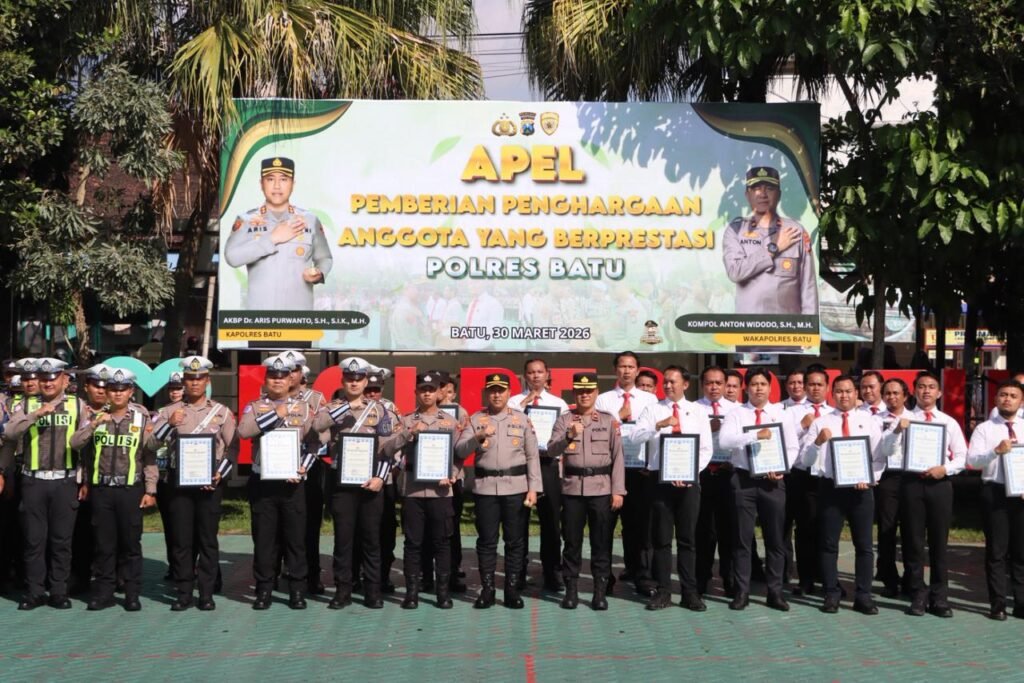 MALANG POST – Apresiasi terhadap kinerja anggota kembali ditegaskan jajaran Polres Batu. Kapolres Batu AKBP Aris Purwanto memberikan penghargaan kepada sejumlah personel berprestasi dalam sebuah apel yang digelar di halaman Mapolres Batu, Senin (30/3/2026).