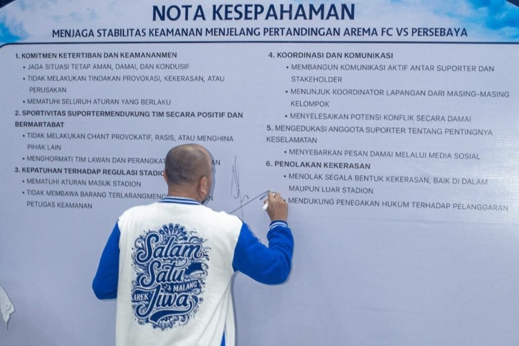 Puncak acara adalah penandatanganan bersama nota kesepahaman yang berisi enam poin komitmen. Dokumen tersebut ditandatangani oleh perwakilan komunitas Arema, koordinator lapangan (korlap) suporter, serta Presidium Aremania, Ali Rifki.