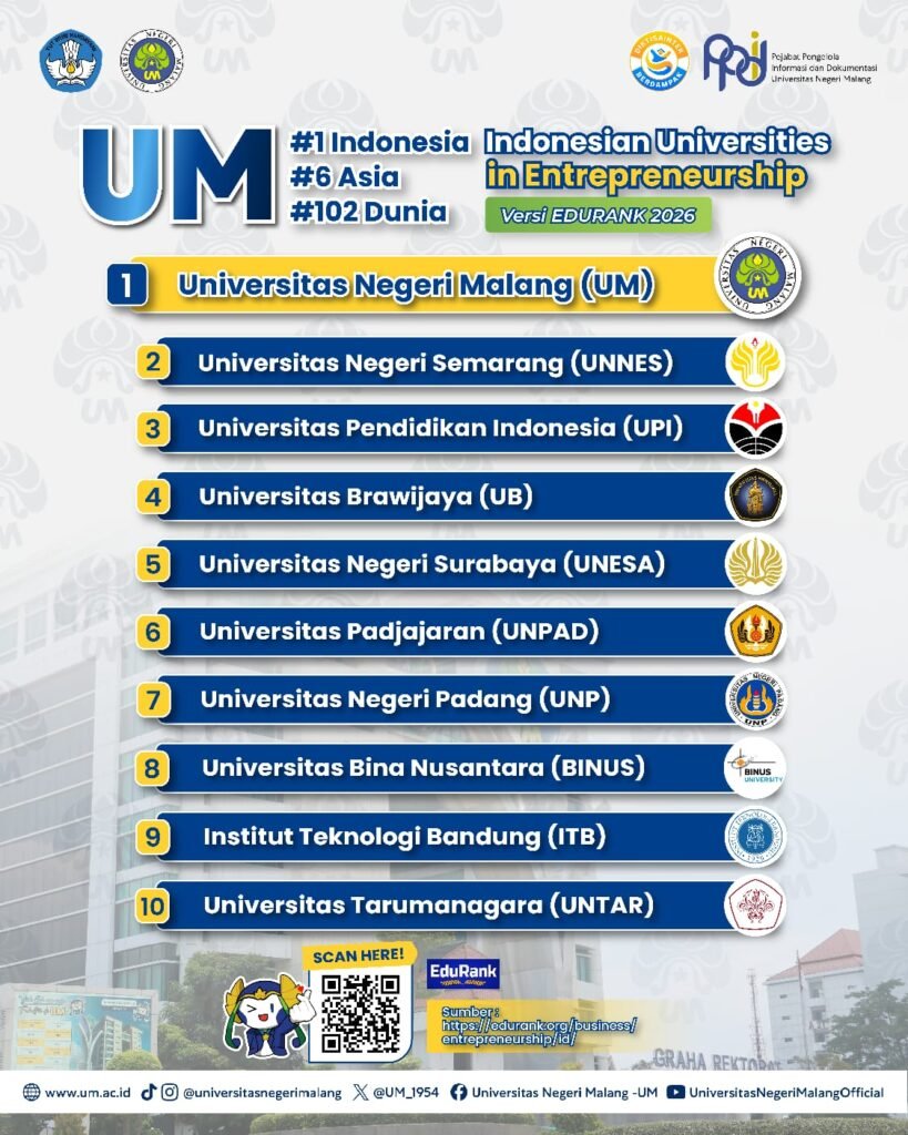 MALANG POST – Universitas Negeri Malang (UM) kembali menunjukkan taringnya di kancah nasional maupun internasional. Melalui berbagai pemeringkatan, UM berhasil mempertahankan posisi di jajaran sepuluh besar Top Rank dan meraih pengakuan yang kian memperkuat reputasi sebagai kampus pendidikan unggul.