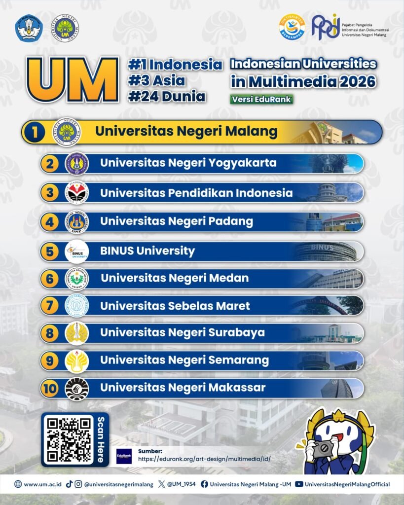 Hasil ini menegaskan posisi UM sebagai salah satu kampus pendidikan terbaik di kawasan Asia, sekaligus memperkuat daya saing pendidikan Indonesia di ruang global. Tak hanya di Asia, capaian serupa juga meluas pada reputasi UM dalam bidang-bidang yang menjadi penopang pembelajaran modern.
