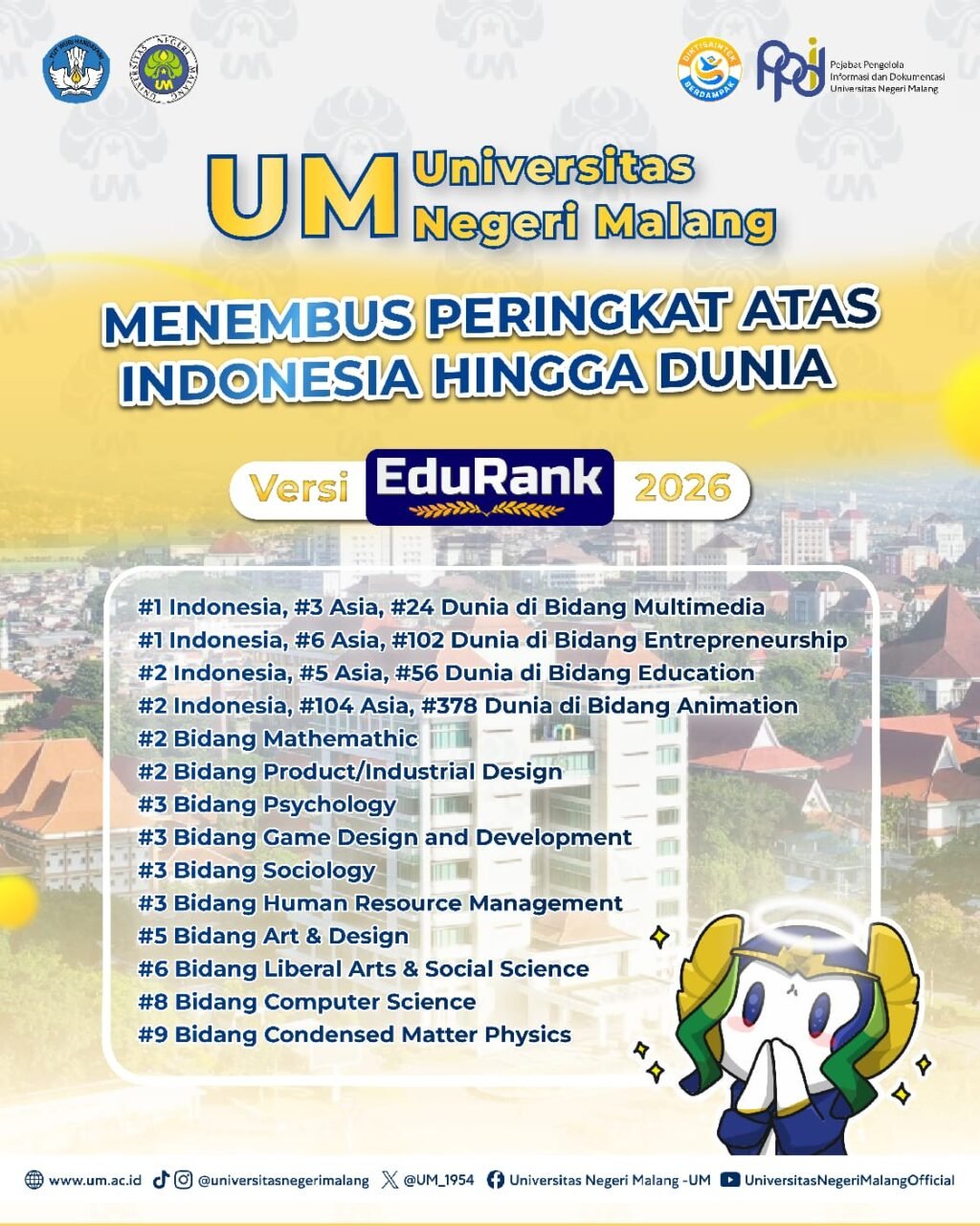 Serangkaian capaian ini menunjukkan bahwa UM tidak hanya dikenal sebagai “kampus pendidikan”, tetapi juga sebagai institusi yang terus mengembangkan keilmuan berbasis inovasi dan relevansi terhadap kebutuhan masyarakat.